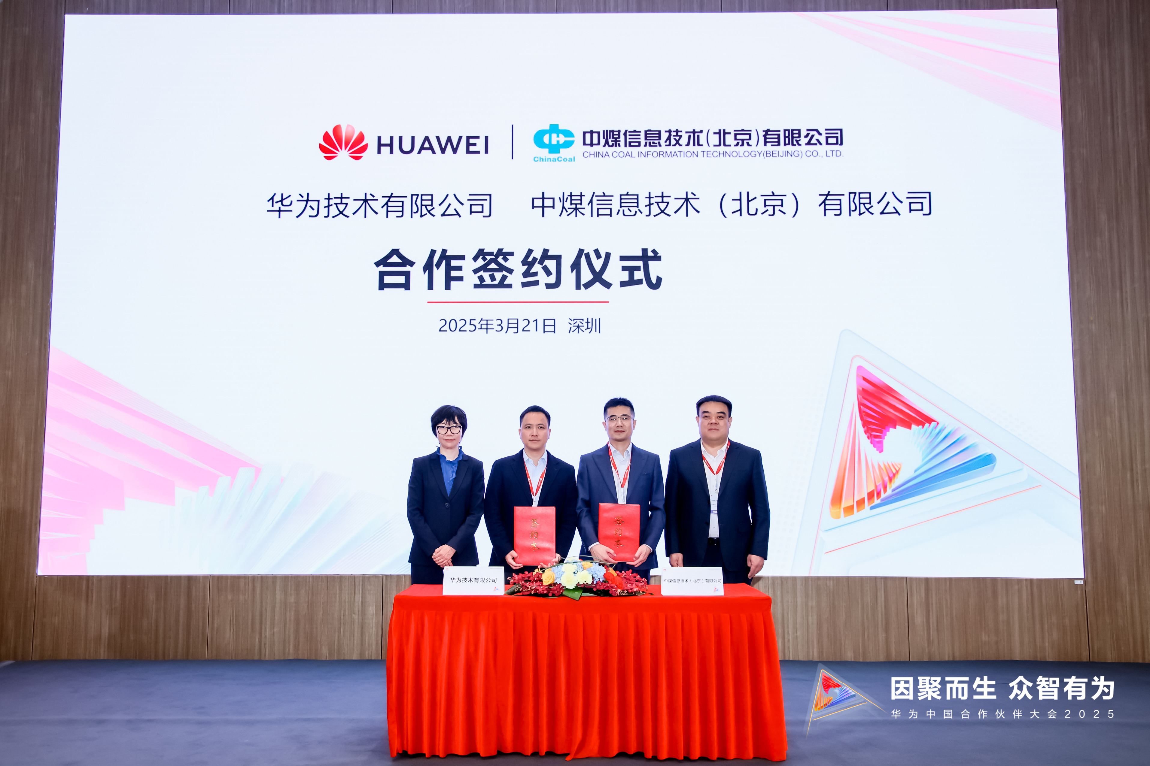 3月20日-21日,以“因聚而生,众智有为”为主题的华为中国合作伙伴大会2025在深圳召开。会上,中煤信息公司与华为正式签署了战略合作协议。中国中煤装备事业部总经理、装备公司党委书记、董事长郑伟立,华为副总裁、油气矿山军团CEO韩硕出席签约仪式。中煤信息公司党委书记、董事王喜升与华为中国政企油气矿山系统代表签约。中煤信息公司党委委员、副总经理黄韶杰在油气矿山分论坛以“数智赋能,矿鸿起航——矿山智能化的‘中煤方案’”为题进行了演讲。