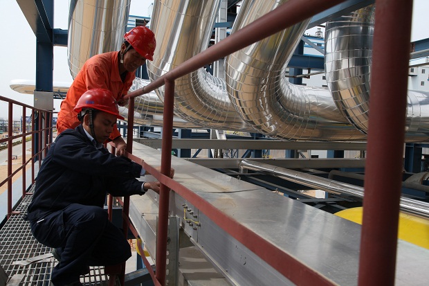 爬到十多米高管廊进行高空检查,对他来说是家常便饭
