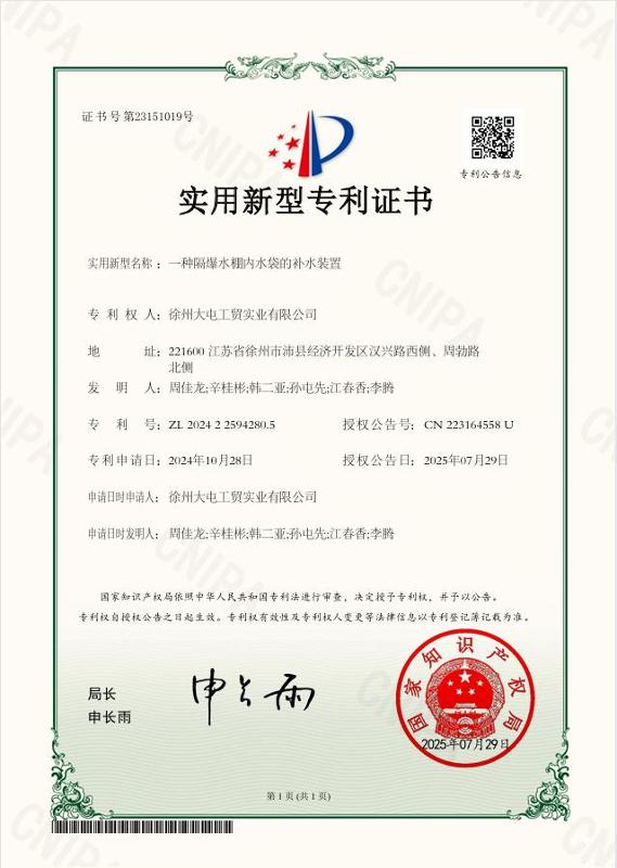 近日,实业公司“一种隔爆水棚内水袋的补水装置”获得国家实用新型专利授权。该装置既能满足隔爆水棚补水的及时性又无需工人爬上爬下加水,安全性高,同时安装和维护简单方便。
