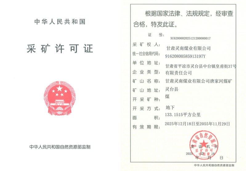 12月18日,甘肃灵南煤业有限公司唐家河煤矿获得甘肃省自然资源厅核发的采矿许可证,这是继11月份该矿取得不动产证书后的又一关键进展,为剩余前期手续办理奠定了坚实的基础。