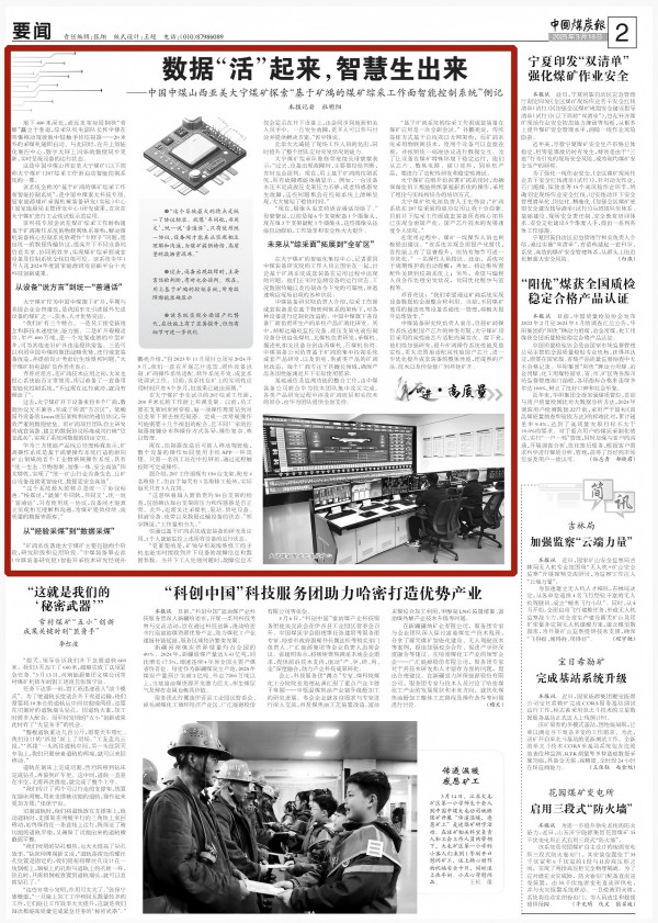 3月18日,《中国煤炭报》刊发《数据“活”起来,智慧生出来》,报道中国中煤山西亚美大宁煤矿探索“基于矿鸿的煤矿综采工作面智能控制系统”情况,全文转发如下:
