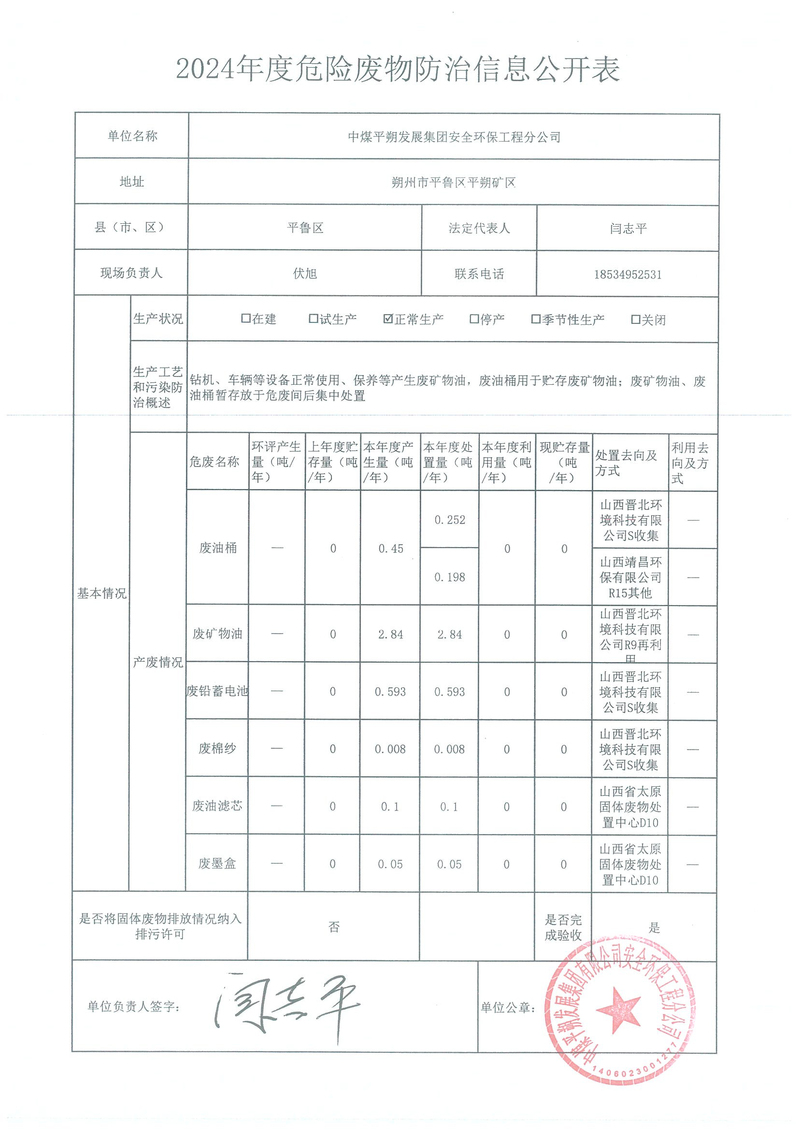 中煤平朔发展集团安全环保工程分公司2024年度危险废物防治信息公开表
