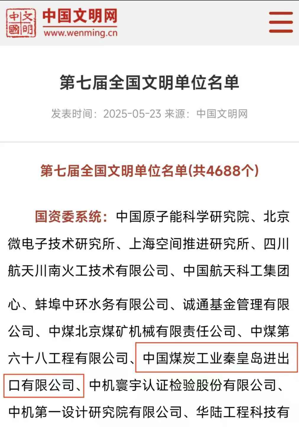 喜报:中国煤炭工业秦皇岛进出口有限公司荣获“全国文明单位”称号