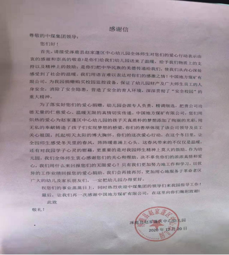赵家蓬区中心幼儿园对此次爱心捐赠活动向地煤公司表达了诚挚的谢意。