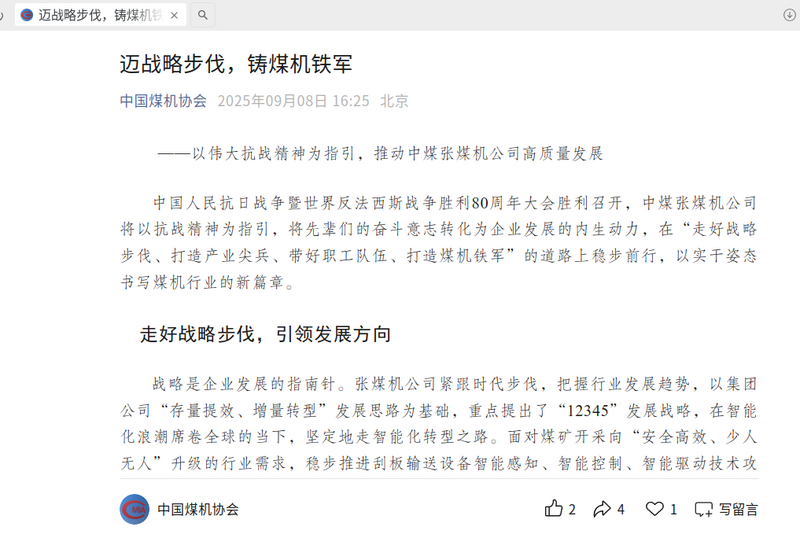 中国煤机协会——迈战略步伐,铸煤机铁军—以伟大抗战精神为指引,推动中煤张煤机公司高质量发展